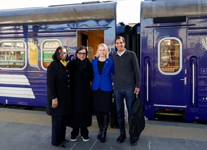 Бріджит Брінк проілюструвала допис фотографією гостей на пероні залізничного вокзалу в Києві, а також на полях Міжвідомчої платформи координації донорів.