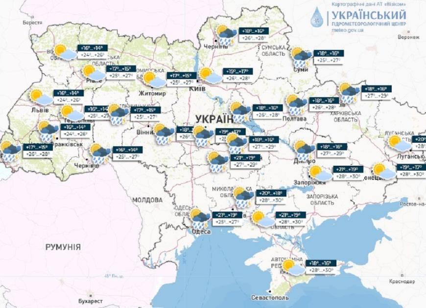 "Вітер північно-західний (на півдні та сході країни південно-західний), 5-10 м/с.Температура вночі 14-19, вдень 25-30; в Карпатах вночі 9-14, вдень 18-23", - пише пресслужба.