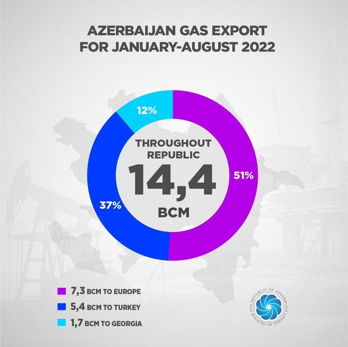 "Порівняно з аналогічним періодом минулого року 14,4 із 30,6 млрд кубометрів видобутого газу з приростом на 9,7% було експортовано", - зазначив глава Міненерго Азербайджану.