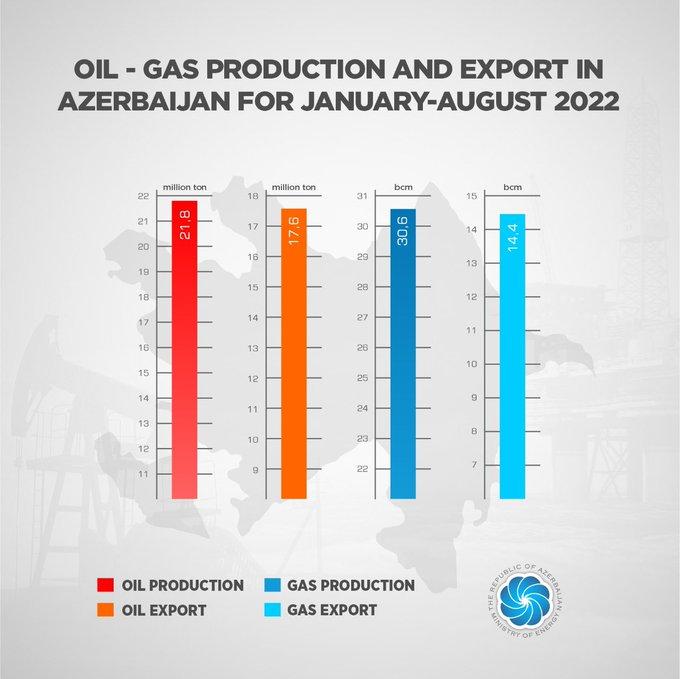Міністерство енергетики Азербайджану заявило про зростання експорту газу та нафти за підсумками 8 місяців 2022 року.